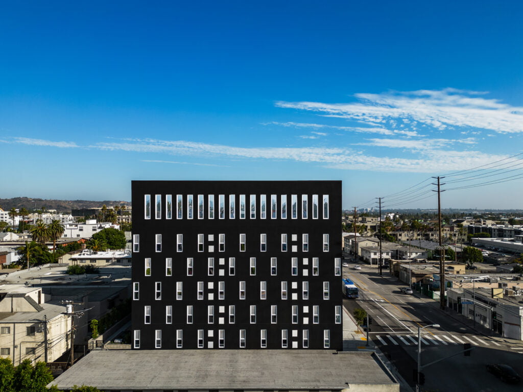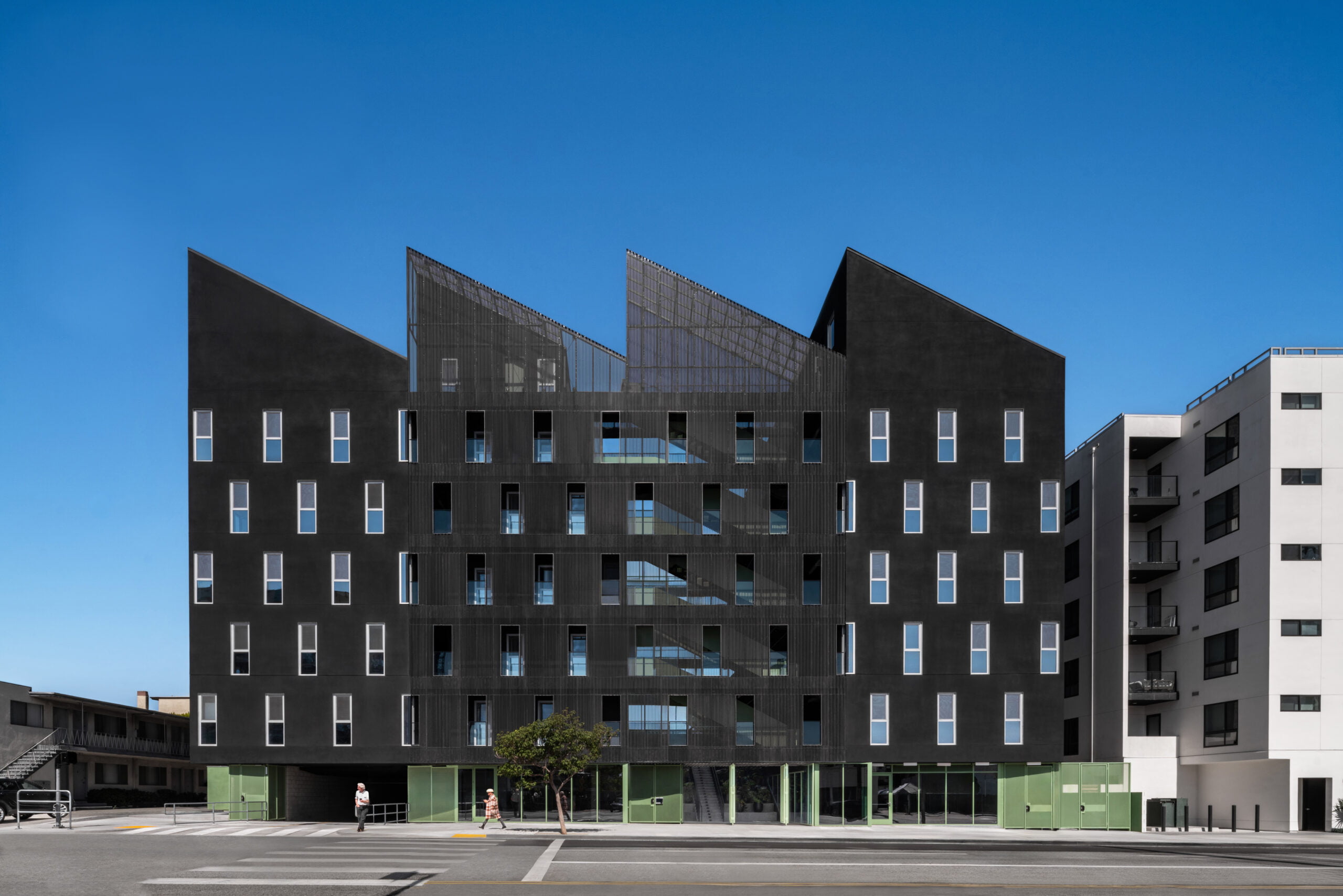 On a rapidly changing West Los Angeles thoroughfare, this 74 unit mixed-use apartment building carves a deep courtyard oasis into a bold and striking outline. Wrapped in a monolithic and relentless perforated pattern of windows and topped with warehouse-inspired sawtooth roof, the building seeks to embrace the scale of Transit-Oriented Community zoning along major boulevards, while maintaining a human-scaled sidewalk presence, a variety of common open spaces at multiple levels, and an active and vibrant play of circulation and life both communal and individual.
