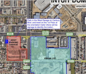 PARKING: Park in the West Garage on Century Blvd. and meet on the 1st Floor at the orientation trailer (there will be signage to identify the trailer). Hard hats, safety vests and glasses are available for your use but feel free to bring your own if you have.